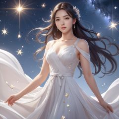 1girl, cute, lovely, sweet, among stars, long dress, pretty face, dynamic angle, masterpiece, ultra-highres, 8k wallpaper, CG unity, delicate lighting and shadows, delicate details, perfect hands, Look at me, Asian girl, best quality, textured skin, super detail