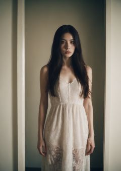 a woman is looking in the mirror,the woman in the mirror is looking at you,long hair,black hair,parted lips,brown eyes,brown hair,mole,standing,lips,moody lighting,polaroid,white dress,lace,white skin,surrealistic,aperture f8.0,