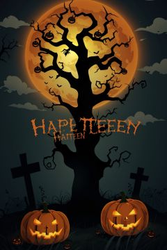 dark clouds,grass,tombstone,English letters,spider,Spider web,Bats,withered tree,full moon,Pumpkin lantern