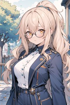 masterpiece,best quality,1girl,long hair,wavy hair,low ponytail,orange hair,large breasts,close-up,outdoors,glasses,alternate costume,<lora:完成版5:1>,