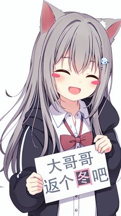 1girl, animal ears, solo, shirt, closed eyes, facing viewer, sleeves past wrists, white shirt, grey hair, blush stickers, holding, hair ornament, cropped torso, bow, long hair, white background, collared shirt, upper body, smile, cat ears, sign, holding sign, bangs, black jacket, simple background, jacket, ^_^, blue bow, :d, open mouth, long sleeves, hair between eyes, hood, hairclip, star (symbol), blush, dress shirt, hood down, romaji text