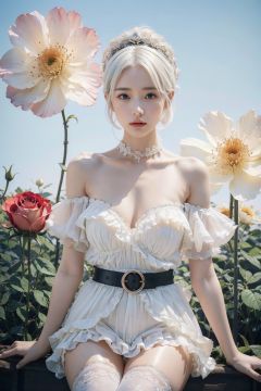 absurdres, absolutely resolution, incredibly absurdres, highres, ultra detailed, official art, unity 8k wallpaper, Kinetic Typography BREAK (1girl, solo:1.4), beautiful and shiny skin, coquettish skin, dynamic poses, dynamic angle, close-up, cowboy shot BREAK (standding, short white hair, beautiful blue eyes:1.2) BREAK (strapless dress, beautiful plunging neckline , belts, leg loops, flower headdress, thighhighs:1.2) BREAK (off shoulder, bare shoulders, bare arms:1.2) BREAK (flower, rose, garden, petal:1.2) BREAK (white theme, english text, border:1.6) BREAK nice hands, perfect hands,