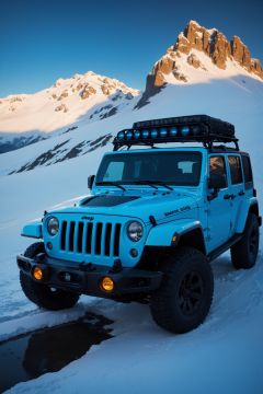 photographic of a Jeep car, snow mountain, epic photo, highly detailed, masterpiece, blue neon lights, cinematic angle, best quality, solo, bokeh, pixiv, depth of field