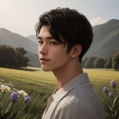 gorgeous male portrait, from the side, looking at viewer, in a meadow, flowers, beautiful hair, manly, gorgeous lighting
