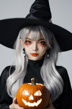 1girl,solo,earrings,jewelry,hat,red eyes,mask,jack-o'-lantern,pointy ears,looking at viewer,long hair,witch hat,halloween,upper body,dress,pumpkin,white hair,black dress,breasts,black headwear,glowing,bangs,closed mouth,witch,thorns,black background,lips,medium breasts,fire,artist name,english text