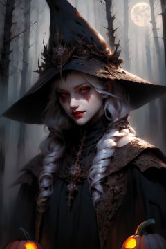 masterpiece,best quality,ultra-detailed,1girl,pumpkin,<lora:lsp-000005:0.7>,white hair,night,black witch hat,moon,forest,upper body,horror theme,<lora:女三:0.7>,red eyes,