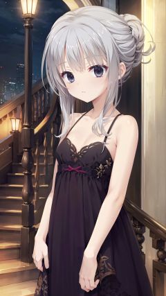 best quality, masterpiece,,(solo),(close up),,a little girl,10 years old,bright silvery hair,(long hair),gray eyes,floating hair,,night gown,(black gown:1.4),bare shoulders, updo,,in palace,hall,stair railing,