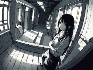 (((best quality,masterpiece,fine detailed,))),<lora:CJ view:0.8>,indoor scene,(large perspective perspective,fisheye perspective picture),(1 girl,long hair,beautiful girl,face to),attic,corridor,wooden furniture,black and white painting,dynamic,exquisite details,absurdres,, (best quality, high quality, masterpiece,),