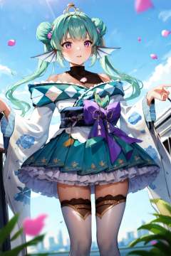 masterpiece, (detailed, highres, best quality), 1girl,  <lora:spfinanaRyugu-09:1> finana2st, twintails, tiara, purple bow, hair flower, white kimono, obi, sash, black bodysuit, green skirt, white thighhighs, blue sky, blurry, blurry foreground, cityscape, cloud, cloudy sky, day, depth of field, house, moe2019, outdoors, petals, sky