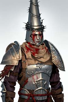 masterpiece, (detailed, highres, best quality), 1boy <lora:sppenitentOne-08:1>, penitentonedef, helmet, stone face, faceless, blood, armor, full armor, shoulder armor, brown gloves, upper body, face focus, simple background