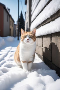 The snow is falling profusely, and a cold city wall, A cat is looking up at the wall outside. The ground is covered in snow, with snowflakes falling one by one, Camera capture, realistic, photography works, perfect composition, and a sense of hierarchy of light and shadow,