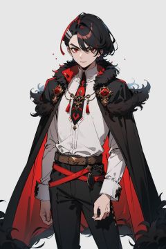 (comb over:1.64),(Spade beetle:1.55),1male,red eyes,black hair,male focus,shirt,white background,white shirt,black and red capelet,simple background,pants,boots,solo,belt,brown footwear,(long sleeves:1.45),black capelet,(black and red fur trim:1.35),looking at viewer,(black fur-trimmed capelet:1.45),(cowboy shot:1.55),(Black hair mixed with red threads:1.45),Cadis Etrama Di Raizel (Noblesse:1.66),male,OuterWorldAI,The Evil Lords,(the upper part of the body:1.55),(Face the audiencs:1.45),(Red and black hair:1.25),fantasy,(Half the bang:1.5)