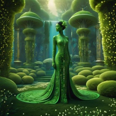 A Matrix code woman, adorned with floral elegance, stands amidst an enchanted garden. Her presence harmonizes with the blooming flora, creating a portrait that transcends the boundaries of the earthly realm.