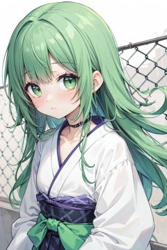 blunt bangs, ceiling, chain-link fence, checkered background, collarbone, green eyes, hexagon, japanese clothes, long hair, looking at viewer, messy hair, solo, upper body, wall,green hair,big hair,loli,messy hair,messy sleeper,hair flowing over