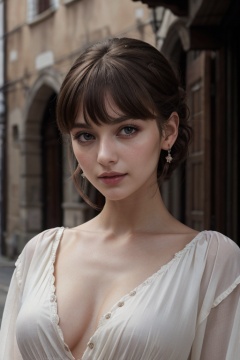 (masterpiece),  best quality,  high resolution,  highly detailed,  detailed background,  perfect lighting,  1girl,  bangs,  ruby eyes,  medium breasts,  blouse,  medieval village,