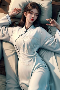(8k, RAW photo, best quality, masterpiece:1.2),(realistic, photo-realistic:1.3), ultra-detailed, extremely detailed cg 8k wallpaper,(crystalstexture  skin:1.2), (extremely delicate and beautiful), (perfect hands, perfect fingers ,perfect anatomy:1.2),(good hands and fingers:1.3), (nice hands:1.3),1girl, solo, red lips, lips, lipstick, makeup, long sleeves, wide sleeves, chinese clothes, pants, looking at viewer, (cowboy shot:1.3), (lying on back), bed shee,<lora:韩国娃娃koreandolllikenessV20_v20:0.4>  <lora:TZC3:0.85>