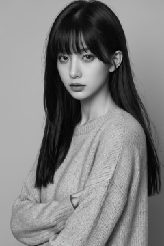 1girl,solo,greyscale,monochrome,looking at viewer,realistic,sleeves past wrists,watermark,lips,bangs,long sleeves,closed mouth,grey background,web address,long hair,upper body,sweater,simple background,nose,<lora:heibai_20231113120702:0.5>,