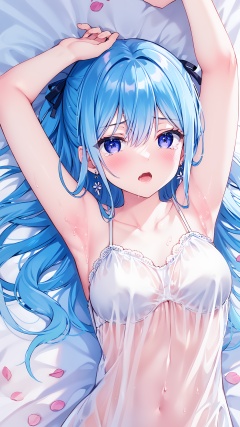 1girl, solo, long hair, blush, open mouth, arms up, bangs, collarbone, armpits, saliva, purple ribbon, purple eyes, on back, lying, sweat, petals, looking at viewer, hair between eyes, bed sheet, ribbon, hair ribbon, blue hair, tears, upper body, earrings, White sheer nightgown, dress,slip dress,breasts, dakimakura (medium), blue eyes
