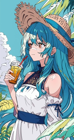 (portrait), (from_side), (looking_away), (turning_head), (upper_body), 1girl, solo, loli, petite, white_hair, (very_long_hair), red_eyes, medium_breasts, (closed_mouth), faint_smile, straight_hair, (glowing_eyes), (bare shoulders:1.2), (transparent_clothing), ((straw_hat)), see_through, (white_dress), wind_lift, hair_lift, (summer), ((white_dress)), branches, (leaves), foreground_bushes, (bushes), tree, forest, sunshine, tyndall_effect,((masterpiece)), (highres), (best_quality), (highly_detailed), (original),(Delicate background),(extremely detailed 8K wallpaper),cinematic lighting, volume lighting, light particles, shaded_face, beautiful_detailed_eyes, depth_of_field, perspective,