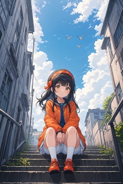 ultra-detailed,(best quality),((masterpiece)),(highres),original,extremely detailed 8K wallpaper,(an extremely delicate and beautiful),anime,\\,BREAK1girl,orange shoes,solo,sitting,sky,clouds,outdoors,black hair,bird,upward view,blue sky,white socks,daytime,orange jacket,building,long sleeves,leaves,long hair,stairs,red headband,pump Rope,headband,bangs,cloudy sky,from_below,wide_shot,
