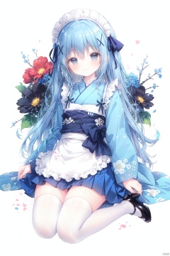 1girl, solo, kafuu chino, kimono, blue flower, apron, flower, thighhighs, blue eyes, wide sleeves, japanese clothes, long hair, blue skirt, skirt, checkered kimono, black footwear, wa maid, sleeves past wrists, white thighhighs, hair ornament, blush, long sleeves, bangs, frilled apron, white apron, blue hair, pleated skirt, blue kimono, parted lips, maid headdress, hair flower, ribbon, frills, very long hair, checkered clothes, hair ribbon, looking at viewer, hair between eyes, high heels, x hair ornament, blue ribbon, pinching sleeves, black ribbon, shoes, maid apron
