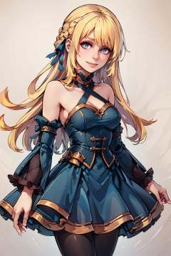 ((masterpiece,best quality)), absurdres,<lora:Marina_Lucce_Maxetto_OC:0.8>, Marina_Lucce_Maxetto_OC, 1girl, solo, blonde, very long hair, french braid,  hair ribbon, frilled choker, criss-cross halter, sleeveless dress, high-waist skirt, backless dress, waist bow, detached sleeves, frilled sleeves, wide sleeves, pantyhose, solo, smiling, looking at viewer, cowboy shot,side view, head tilt,