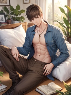 Gavin,<lora:Gavin:1>,1boy,male focus,brown pants,abs,jewelry,pants,solo,looking at viewer,necklace,wooden floor,sitting,key,indoors,ball,plant,long sleeves,navel,book,pillow,pectorals,open clothes,, masterpiece,best quality