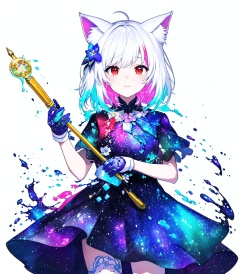 [(white background:1.4)::10],(Galaxy),((colorful ink splash flower))((best quality)), ((masterpiece)), ((ultra-detailed)), (illustration), (detailed light), (an extremely delicate and beautiful),incredibly_absurdres,[(white background:1.4)::10],(Galaxy),((colorful ink splash flower))(1girl:1.7),solo,a beautiful girl,magician,(((cowboy shot))),standding,(+perfect hand+:1.21),(((holding a Wand))),(((cat ears))),((Hosiery)),((galaxy adorns beautiful colorful dress):1.5),((white hair)),(((red eyes))),[colorful ink flowing],(chromatic aberration with strong rim light, glitch),tyndall effect, colorful refraction,visual impact,Spray paint graffiti,(((melting and splashing))),(highlight contrast),((color splashing)),((ink splashing)),((dyeing)),melt,multicolored ink melt,watercolor,colorful ink splashing surrounded,fluttered detailed ink splashs,(((science fiction))),[(white background:1.4)::10],(Galaxy),((colorful ink splash flower))