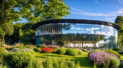 Ornamental Grass, Landscape Design,Beautiful natural scenery, pieces of bamboo forest, swaying, the beauty of bamboo, detailed,((Best quality)),((Best quality)),((realistic)),((exterior view)),photo realistic,(masterpiece),orante,super detailed,intricate,photo like image quality, ((a steel structure translucent tensioned membrane ceiling:1.3)),((( with a round glass buildings:1.5)), part of the house surrounded visible through the branches by landscape plants, trees, flowers, shrubs, masterpiece, and, best quality, no humbs, outdoors, scenery, tree,flowers, road, grass, nature, garden, guilin muggle, ((Best quality)),((Best quality)),((realistic)),((exterior view)),photo realistic,(masterpiece),orante,super detailed,intricate,photo like image quality, ((Best quality)),((Best quality)),((realistic)),((exterior view)),photo realistic,(masterpiece),orante,super detailed,intricate,photo like image quality