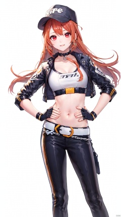 xiaojuzi, 1girl, solo, red eyes, long hair, brown hair, smile, baseball cap, belt, black gloves, black pants, medium breasts, choker, fingerless gloves, gloves, hand on hip, hands on hips, hat, jacket, leather, looking at viewer, midriff, navel, pants,