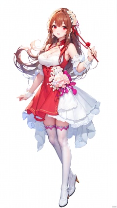 xiaojuzi, 1girl, solo, red eyes, long hair, brown hair, bangs, smile,bare shoulders, beads, cleavage, dress, earrings, flower, frills, hair flower, hair ornament, holding, jewelry, lips, long hair, , medium breasts, parted lips, pink rose, red dress, red lips, red rose, sleeveless, sleeveless dress, thighhighs, white dress, white flower, white legwear, white rose, wrist cuffs, zettai ryouiki,cowboy shot, standing, looking at viewer,