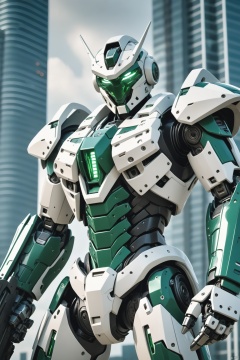 A green and white HUBG_Mecha_Armor robot, He's ceramic, and he holds sword Standing in front of a skyscraper,