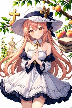 (\ba ba la\),1girl, solo, dress, own hands together, white background, white dress, simple background, looking at viewer, bare shoulders, long sleeves, hat, book, closed mouth, long hair, detached collar, own hands clasped, detached sleeves, white headwear, smile, latin cross, bow, cross, blush, hair ornament, white sleeves, strapless, frills,Peach tree, TrueLove,小心思