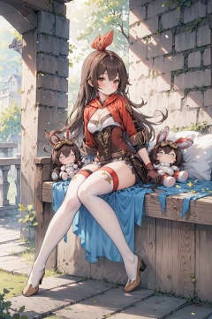 best quality,(masterpiece:1.3),fullbody,ultra-detailed,solo:1.3,1GIRL,amber \(genshin impact\) scenary,forest,sitting,goggles, long hair,gloves,shorts,brown hair,red thighhighs, cleavage, red ribbon, long sleeves, shrug \(clothing\), jacket,pouch,goggles on head,rabbit doll,   <lora:amber:1>