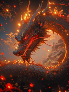 (\long yun heng tong\), eastern dragon, red eyes, glowing, glowing eyes, no humans, open mouth, horns, teeth, scales, fire, (\long yun heng tong\)