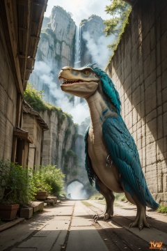 (Dinosaurs), T. rex, Jurassic, huge body, eyes of vertical line pupils, blue-green feathers covering upper body and tail, sides, strong tail strike, attack state, sharp claws, , a sense of solitude, petals,Surrealistic imagery, dreamlike atmosphere, vibrant and contrasting colors, intricate and detailed elements,(Tyndall effect:1.2),((Best quality)),((Best quality)),((realistic)),((exterior view)),photo realistic,(masterpiece),orante,super detailed,intricate,photo like image quality, future, Indo, pz