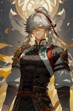 <lora:景元V1:1>,<lora:效果提升写实感与饱和度AQLORA:1>,<lora:修手neg4all_bdsqlsz_V3.5:0.8>,<lora:效果肌肉滑块muscle_slider_v1:0.5>,jinyuan,hair ribbon,(yellow eyes:1.5),ribbon,red ribbon,cowboy shot,long hair,,, masterpiece,best quality,masculine appeal,handsome face,finely detailed eyes and face,youthful face,detailed eyes,Perfect features,narrow_waist,male focus,1boy,