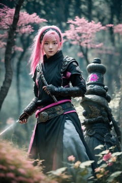 (masterpiece, top quality, best quality, official art, beautiful and aesthetic:1.2) ,cover art, rpg concept art, intricate details, Flickr, dslr, Dota style, matte, Heavenly [Prussian:Tibetan:10] (Female Naruto-style ninja:1.2) , Pink hair, octane engine, sunbeam, ultra high res, Mannerism Art, 64K, extremely detailed CG Unity 8k wallpaper