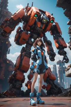 professional 3d model A girl wears a mech suit with a dynamic character,wearing mecha shoes,20 years old,full_shot:1.2,the pose of the character is dynamic,the atmosphere is a bit hazy,to give the scene a dreamy and ethereal quality,2.5D,with a secret mech style,absurdres,detailed,the background in the skyscraper,with green lights and metal versions,with the ruins world,SMOOTH and StreamLined Design,the blue light and red details on the mech,<lora:JA-000010:1>, . octane render, highly detailed, volumetric, dramatic lighting