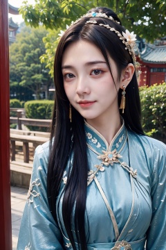 CAFC,1girl,solo,long hair,blue clothes,earrings,jewelry,hair accessories,upper body,suburban scenery,east asian,chinese style architecture,