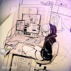 <lora:游戏图标研究所插画:1>a drawing of a girl playing a game on a computer keyboard and a keyboard with a keyboard and a keyboard on the table, 1girl, solo, short_hair, bangs, thighhighs, long_sleeves, sitting, monochrome, greyscale, shoes, shorts, indoors, hood, blunt_bangs, hair_bun, from_side, sleeves_past_wrists, double_bun, hoodie, headphones, chair, traditional_media, phone, hood_down, plant, sneakers, instrument, desk, can, guitar, cable, computer, earphones, monitor, electric_guitar, office_chair, drawing_tablet, nike