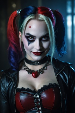 (best quality,4k,8k,highres,masterpiece:1.2),ultra-detailed,(realistic,photorealistic,photo-realistic:1.37),dark evil style,Harley Quinn,fantasy,creepy look,creepy smile,portrait,gloomy atmosphere,distorted make-up,dark clothing,menacing eyes,smudged lipstick,gothic setting,ominous lighting,gritty details,sinister expression,shadowy background,hauntingly beautiful features,macabre vibe,unsettling charm,ominous color palette,sharp contrast,menacing gaze,sinister grin,evil intentions,untamed hair,fiery red and black hair,piercing eyes,vividly dark colors