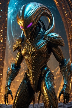 (best quality,4k,8k,highres,masterpiece:1.2),ultra-detailed,realistic, HDR, [alien], [monster], [intricate carving], [armor], [extraterrestrial], [futuristic], [titanium], [metallic], [sharp edges], [glowing eyes], [sinister smile], [bioluminescent patterns], [otherworldly], [menacing presence], [elaborate design], [mysterious], [powerful], [dominant], [intimidating], [exotic], [metal plating], [high-tech], [ethereal], [dangerous], [alien civilization], [ornate details], [advanced technology], [intergalactic warrior], [ferocious], [intricate engravings], [sculptural elements], [mythical creature], [astral shimmer], [cosmic energy], [alien world], [dystopian], [epic battle scene], [surreal landscape], [imposing figure], [demonic features], [alien being]