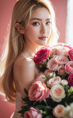 Ultra-realistic 8k CG,masterpiece,best quality,(photorealistic:1.4),HDR,absurdres,Professional,RAW photo,lens flare,(film grain:1.1),Bokeh,((Depth of field)),studio light, a woman in a pink dress , a bouquet of flowers in front of a mirror and a pink background, 1girl, blonde_hair, bouquet, flower, lips, long_hair, looking_at_viewer, pink_dress, smile, solo, Highly detailed,Professional,extreme detail description;,