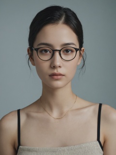 raw photo of a beautiful 25 year old woman,mixed etnicity,a woman with glasses with yellow lenses,(nude:1.4),(small breasts:1.2),leather band around chest covering breasts,nonbinary model,blonde messy pixie cut hair,looking straight into camera,professional makeup,(medium shot portrait:1.5),(hyperrealism:1.2),(photorealistic:1.4),Alessio Albi,fashion,photography,photography-color,portraits,studio lighting,beauty dish,Diffused light soft even glow,shot with Canon EOS 5D Mark IV,Telephoto lens,detailed face,detailed hair,Depth Of Field,fabric background,cinematic framing,low camera