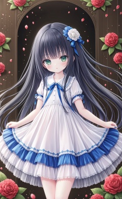 masterpiece,best quality,very long hair,cowboy shot,moinszero,moinszero,moinszero,moinszero,moinszero,moinszero,moinszero,moinszero,moinszero,moinszero,moinszero,moinszero,moinszero,moinszero,moinszero,moinszero,1girl,long hair,solo,green eyes,ribbon,hair ornament,blush,black hair,nail polish,hair flower,blue ribbon,flower,looking at viewer,blue nails,dress,argyle,bangs,very long hair,