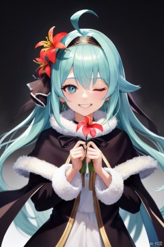 highres, best quality, 1girl, ahoge, ainu clothes, aqua eyes, aqua hair, capelet, commentary, dress, flower, fur-trimmed capelet, fur trim, gold trim, green ribbon, grin, hair flower, hair ornament, headband, highres, holding, holding flower, lily of the valley, long hair, mallope, neck ribbon, one eye closed, by artist Phil Noto