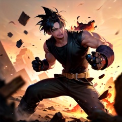 ((masterpiece, best quality)),(complex light),absurdres, highres, 1boy,solo,fighting stance, goku black,black hair,black eyes,blue fire destroyed debris background,smirk