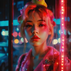 guaiguailuli girl, cinematic film still, cute princess peach standing behind a glass. Neon lights, possibly from a cityscape or urban setting, are superimposed on the image, casting a red hue and adding to the ambiance. The background is blurred but suggests an urban environment with reflections and lights. moody and atmospheric tone. The individual's face is partially obscured by what appears to be a smoky or misty effect. princess peach is sad, head slightly tilted. In Casey Baugh's evocative style, <lora:poaklggllgirl-000007:0.8>