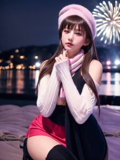 1girl,fashion model,female focus,(masterpiece, realistic, best quality, highly detailed, profession),asian,pretty,Charming eyes,exquisite facial features,bangle,sweater,scarf,skirt,black stockings,boots,sitting,night,neon,beach of city,new year,cinematic composition,,blurry,plns,sw, fireworks, hand101